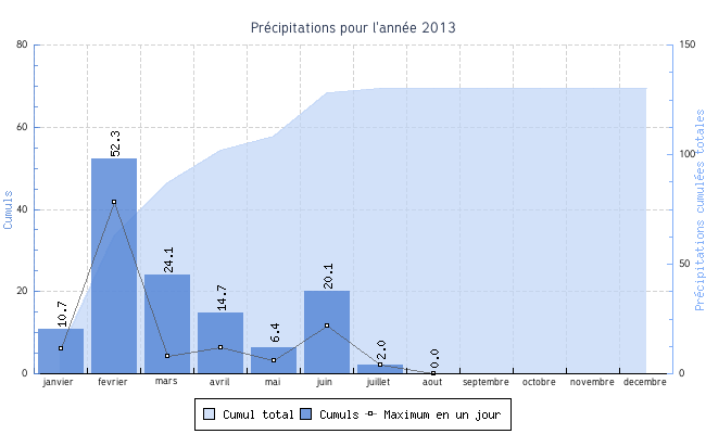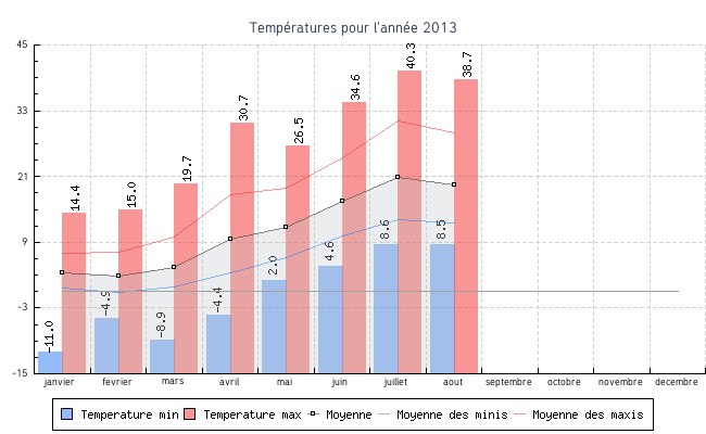 | juillet | 8.6 °C | 13.2 °C | 40.3 °C | 31.1 °C | 20.9 °C | 1.7 km/h | 30.6 km/h | ONO |