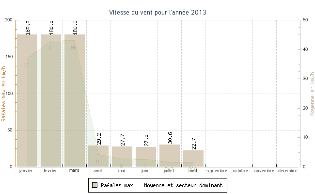 | mars | -8.9 °C | 0.8 °C | 19.7 °C | 10.0 °C | 4.4 °C | 43.0 km/h | 180.0 km/h | NE |