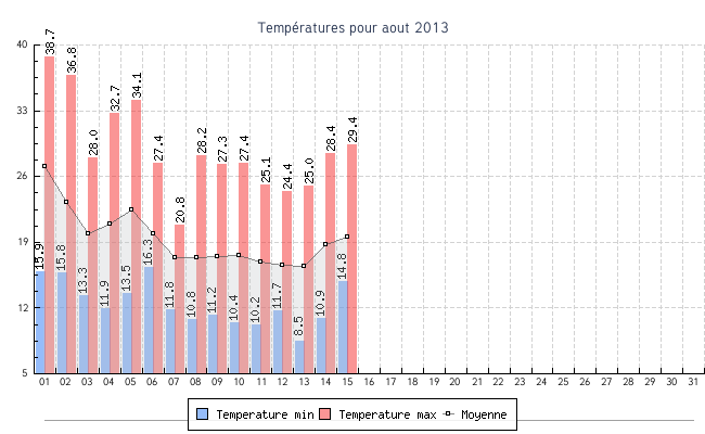 | 01 | 15.9 °C | 38.7 °C | 27.1 °C | 3.8 km/h (17.6 km/h) | ESE |
