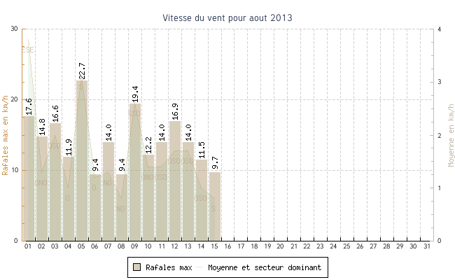 | 15 | 14.8 °C | 29.4 °C | 19.5 °C | 0.8 km/h (9.7 km/h) | S |